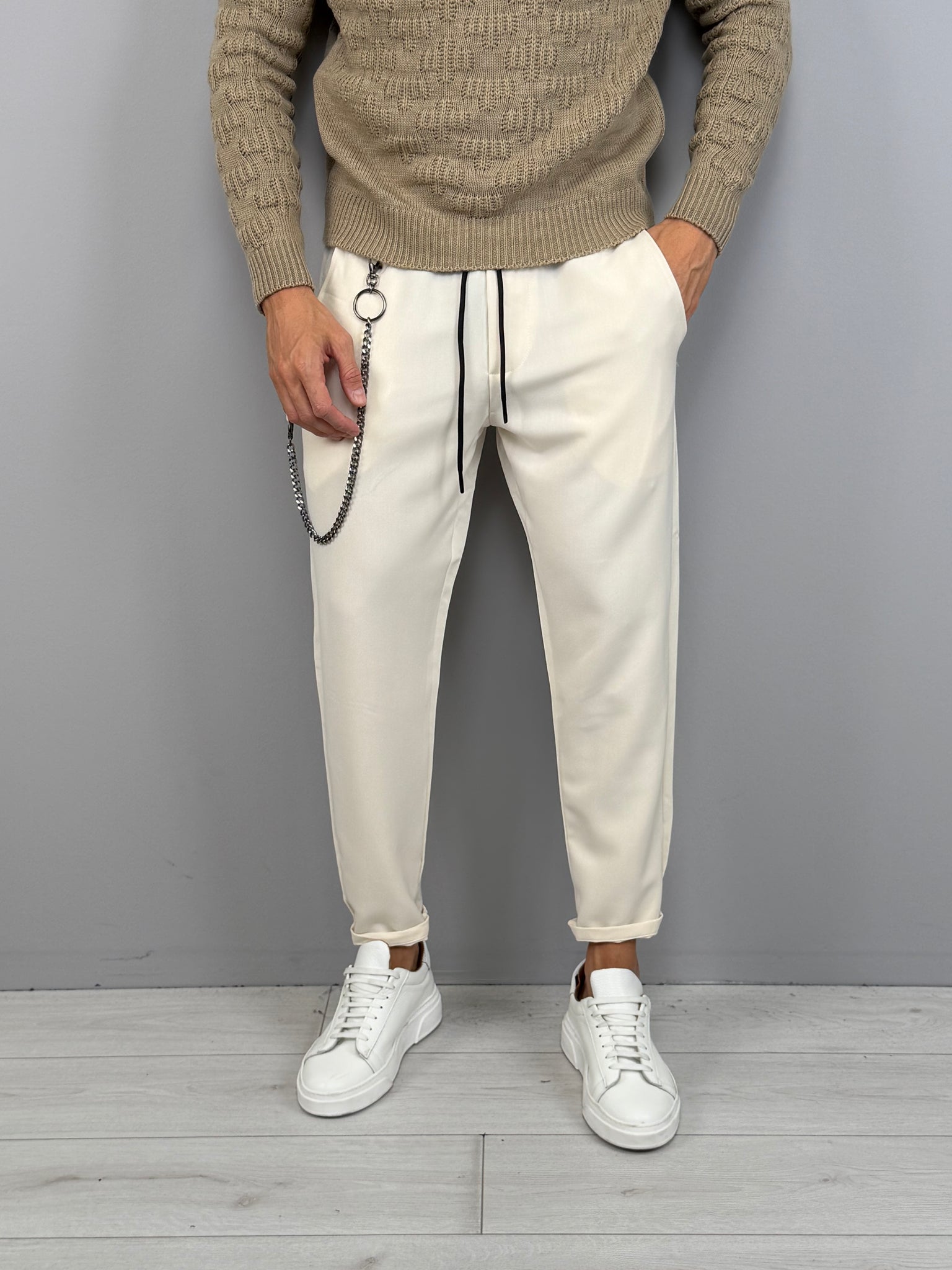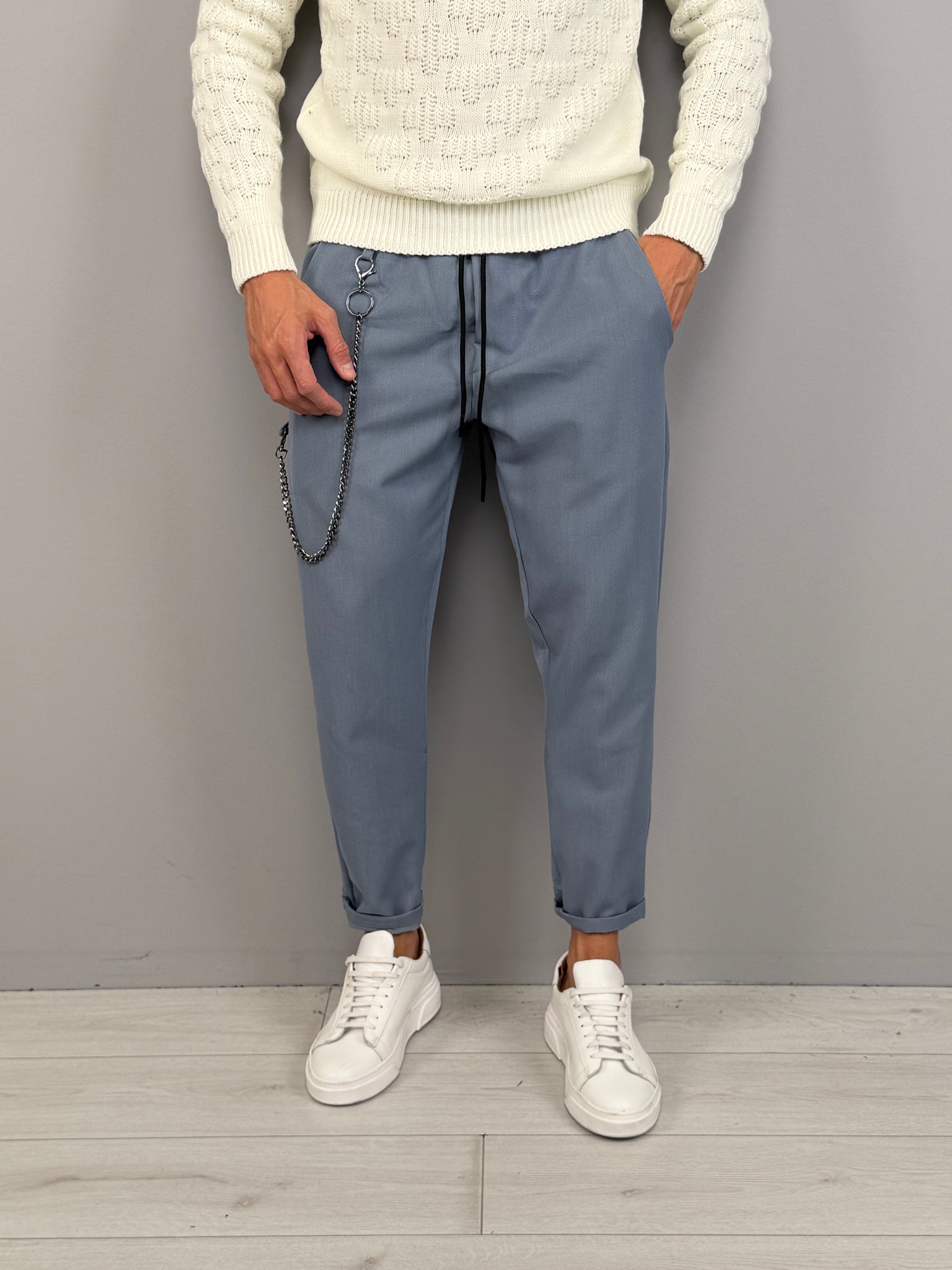 Disponibile nelle tonalità Panna e Jeans, è pensato per la stagione autunno/inverno e si distingue per i dettagli moderni come la catena laterale removibile, che aggiunge carattere e personalità al look. Il fondo leggermente risvoltato e il taglio affusolato lo rendono perfetto sia con sneakers che con calzature più pulite. Un capo versatile, deciso, pensato per un uomo dinamico e attento allo stile.