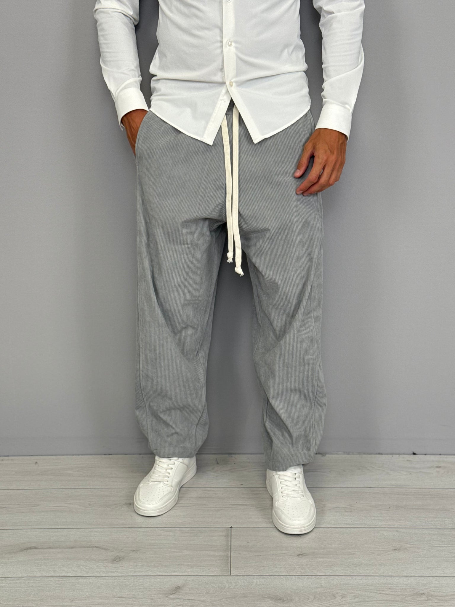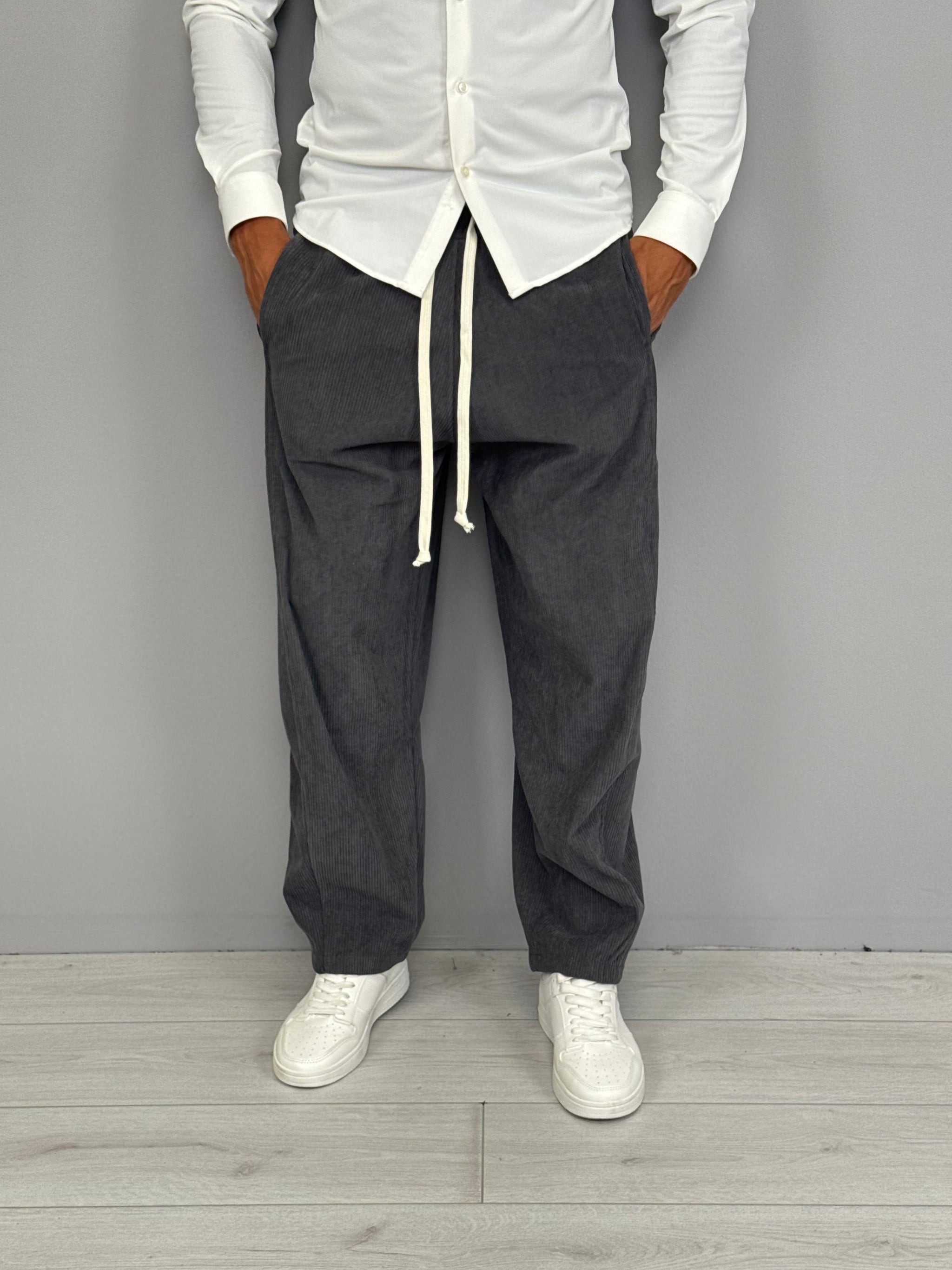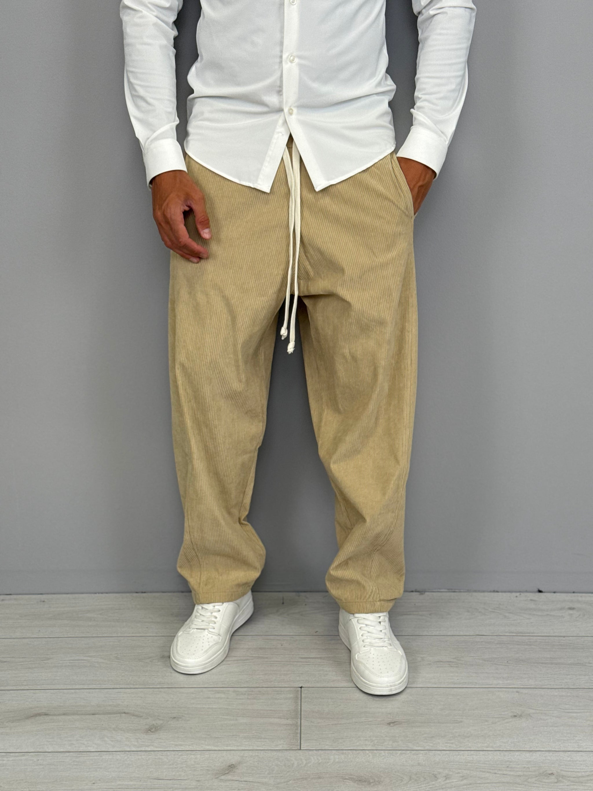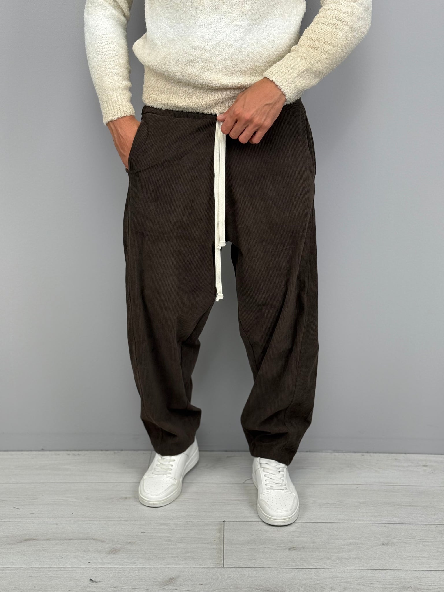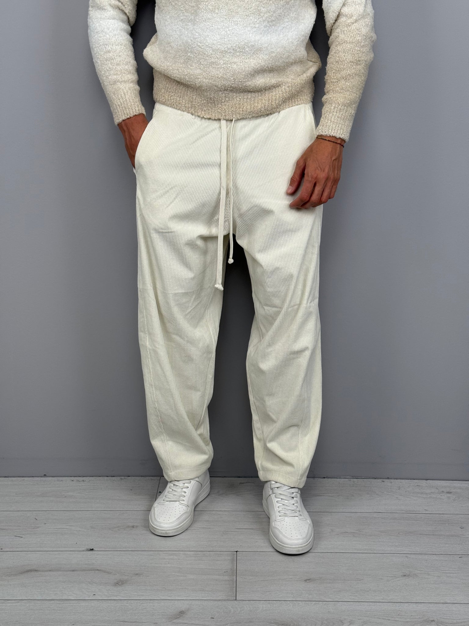 Il design con vita elasticizzata e coulisse regolabile assicura una calzata comoda e adattabile, mentre le linee pulite e il tessuto vellutato aggiungono un tocco di eleganza contemporanea. Le tasche laterali completano il look con funzionalità e praticità.