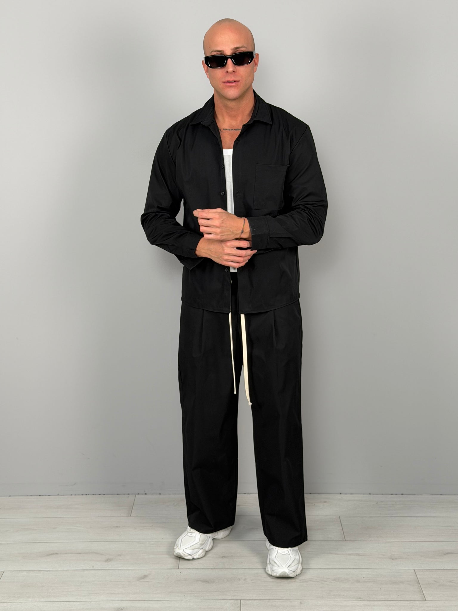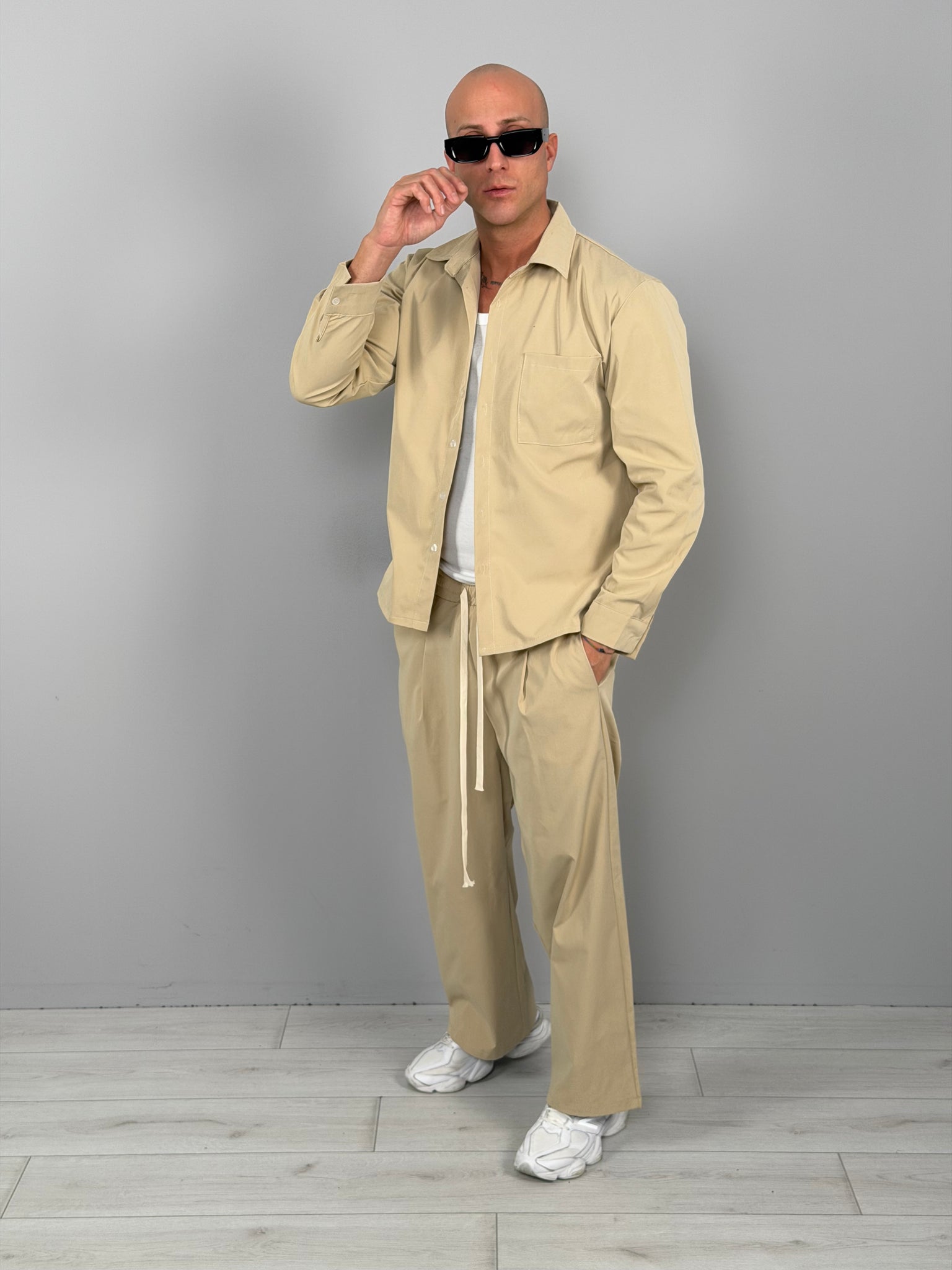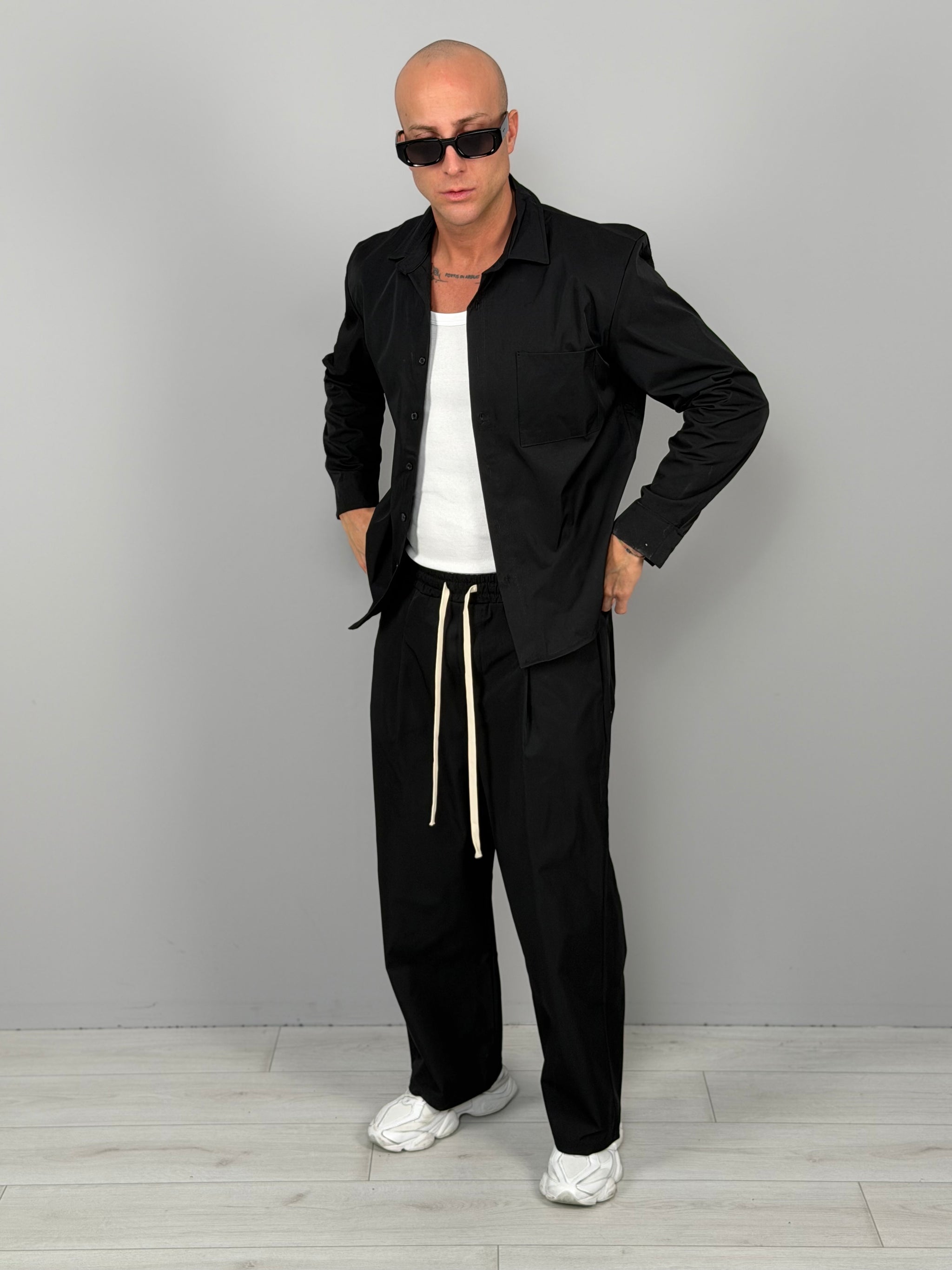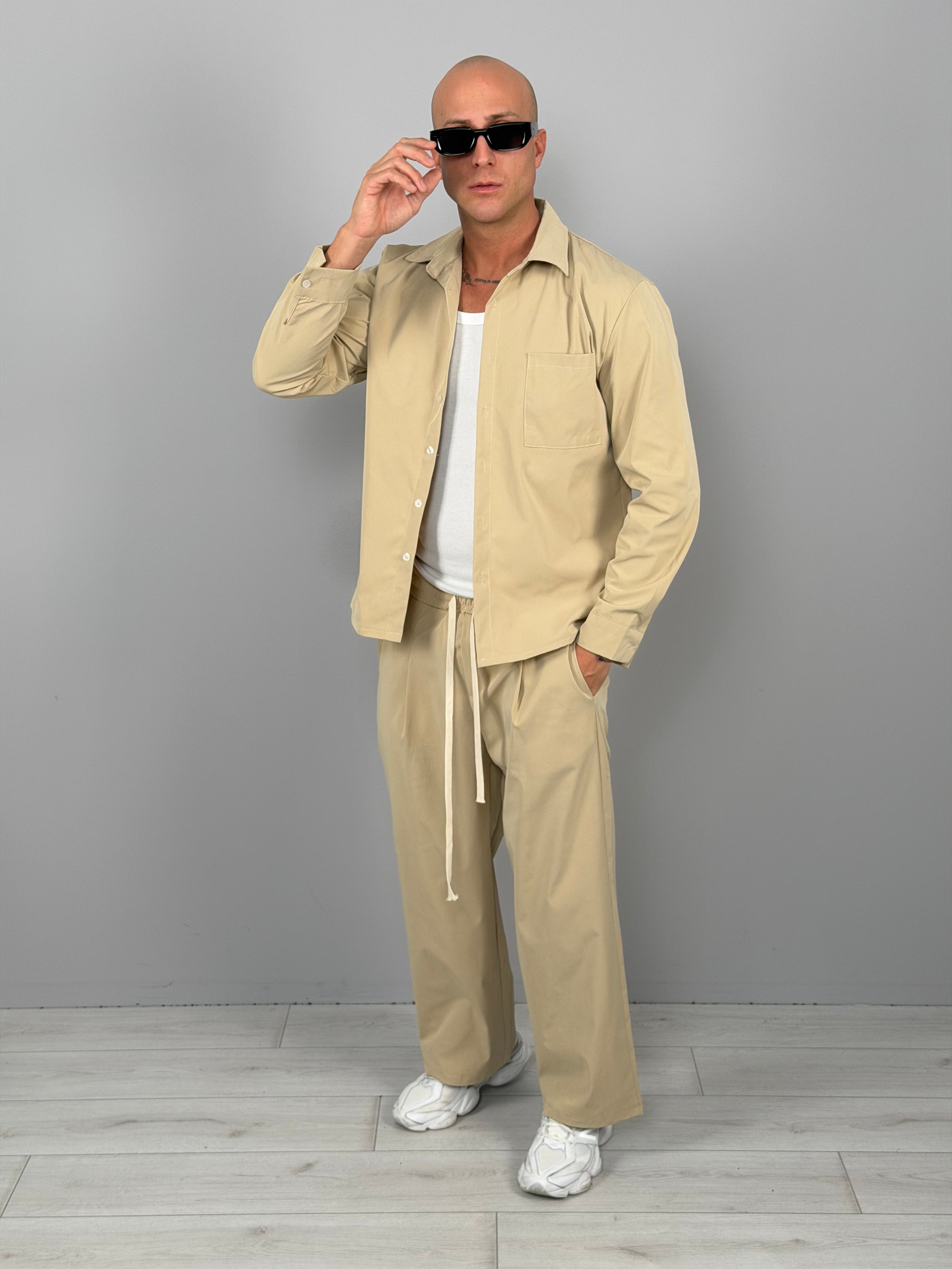The set features a clean-cut overshirt with a front pocket, paired with loose-fitting trousers with a soft crease and contrasting drawstring for a super-modern street style. Available in two super versatile colors: sand beige for a refined summer look, or all-black for a bolder, nighttime look.