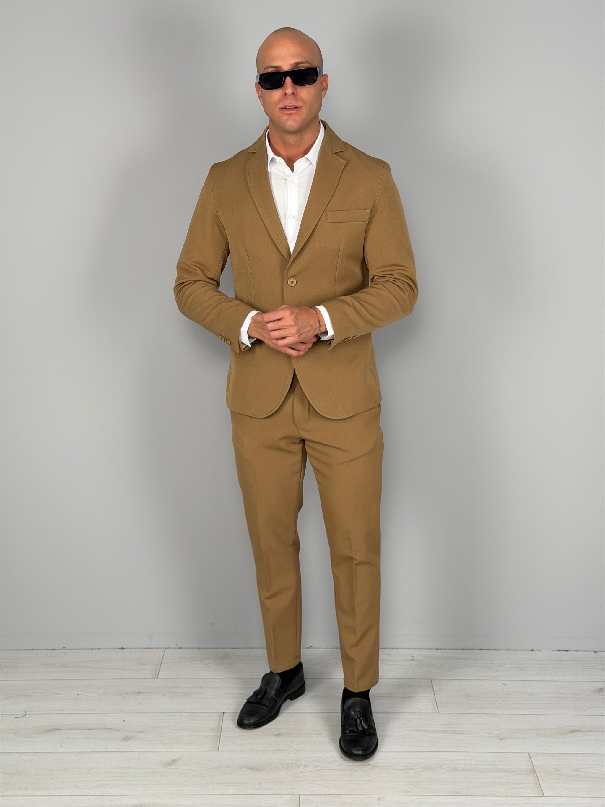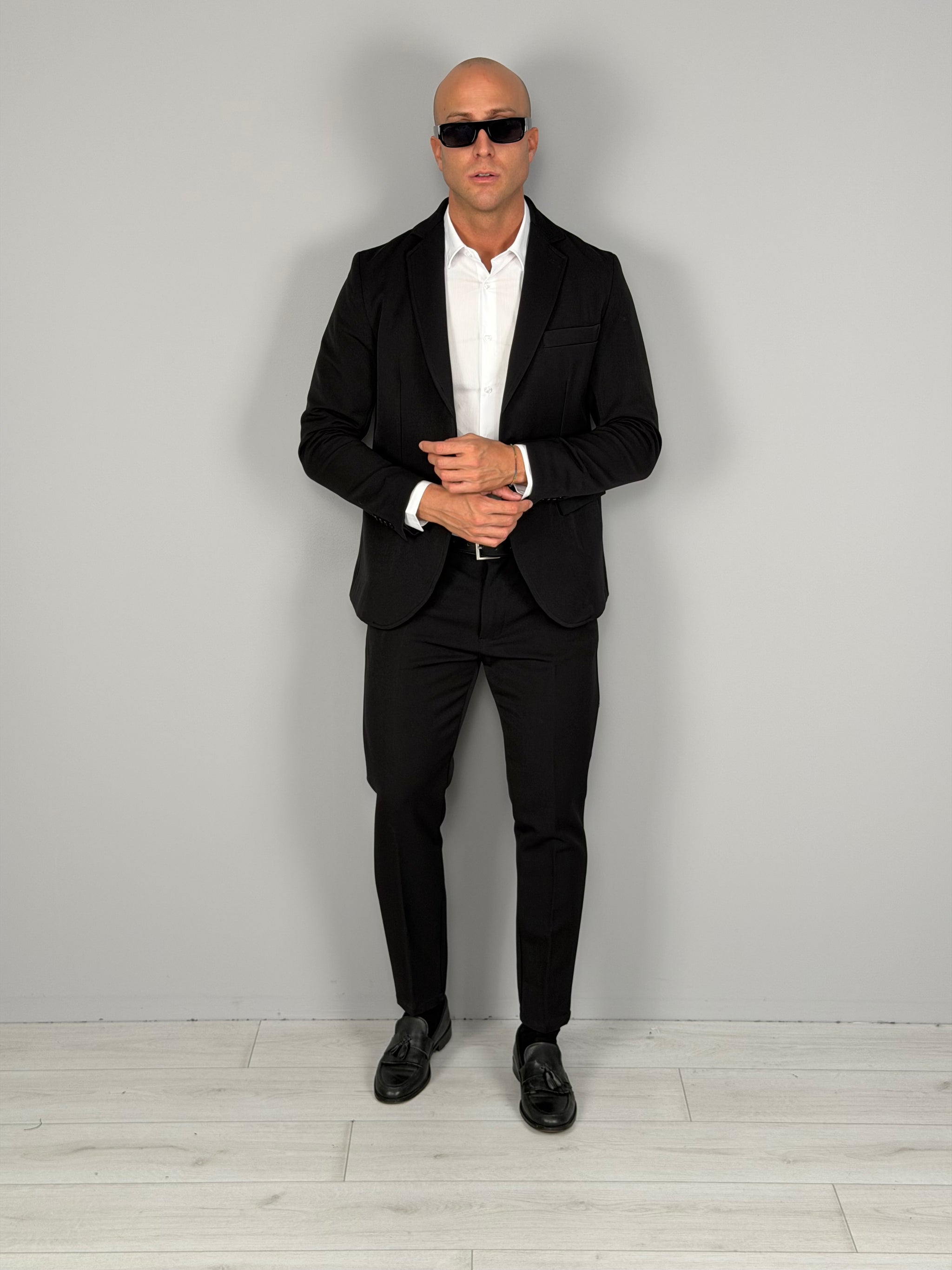 • Dettagli: giacca monopetto con due bottoni, tasche laterali a pattina, pantalone coordinato