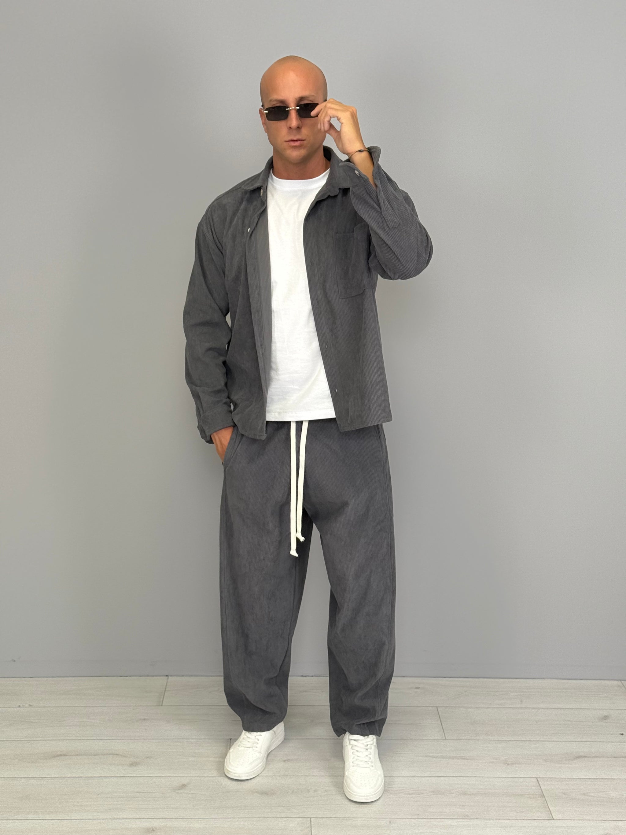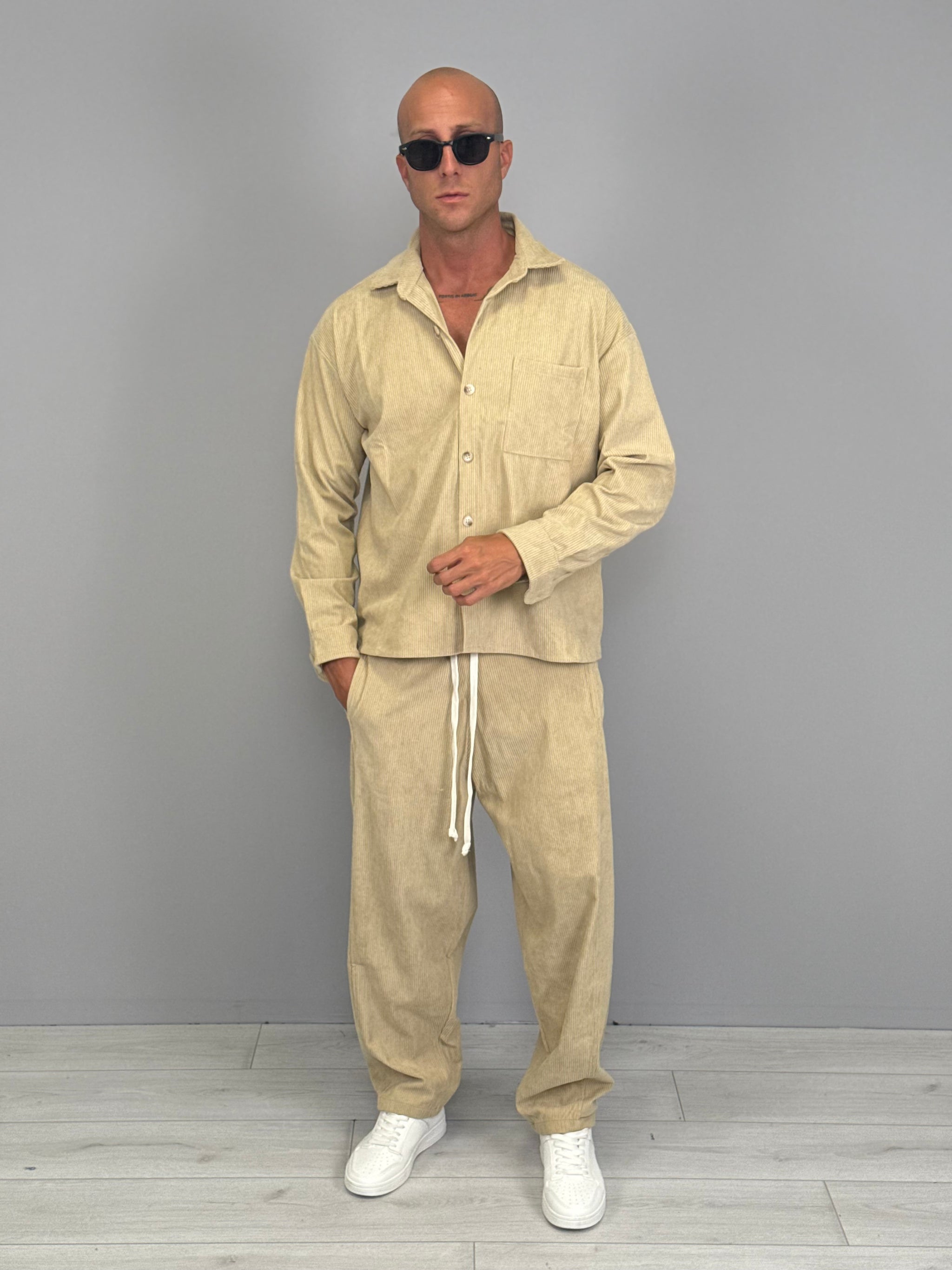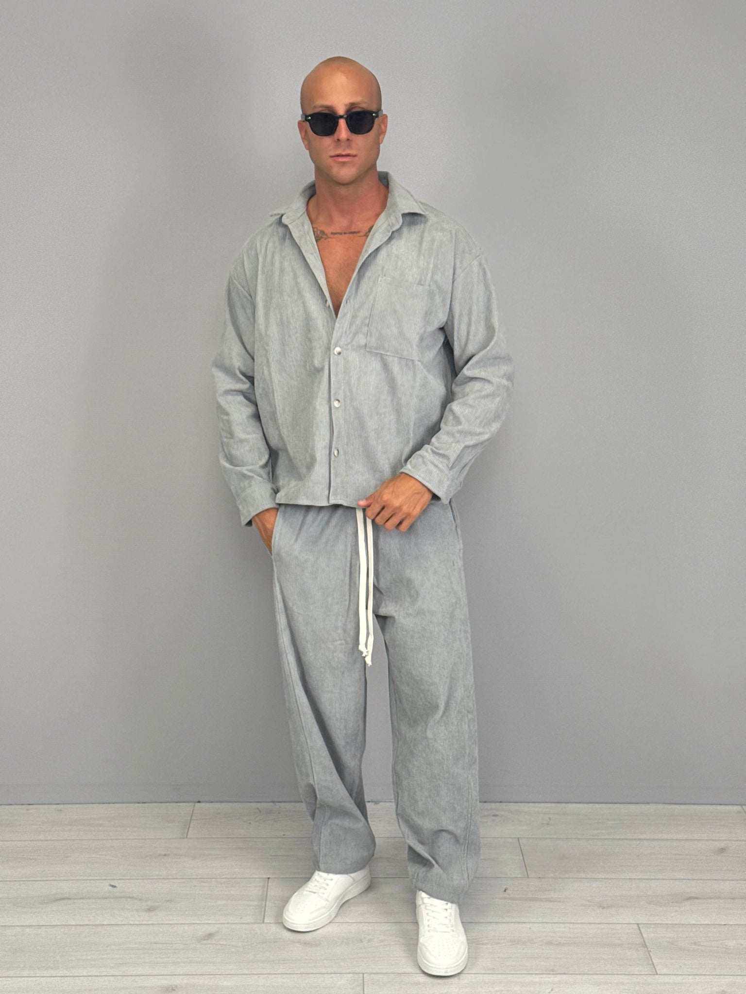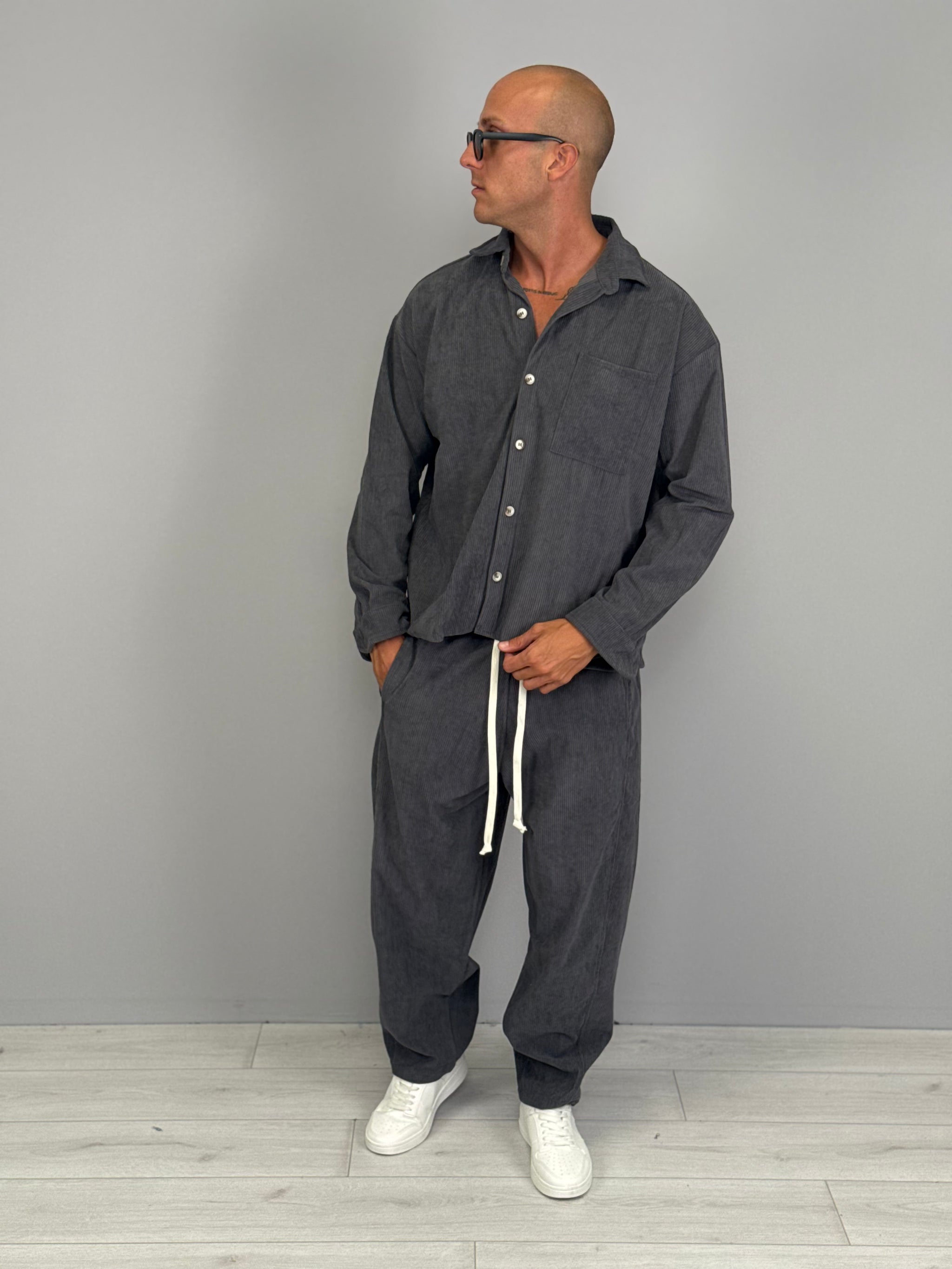 Composto da camicia overshirt e pantalone ampio con coulisse, questo completo offre una vestibilità regolare che valorizza la figura senza rinunciare alla libertà di movimento. Il tessuto in velluto a costine dona una texture elegante e un tocco sofisticato, mentre la chiusura frontale a bottoni e le tasche laterali ne accentuano la praticità.