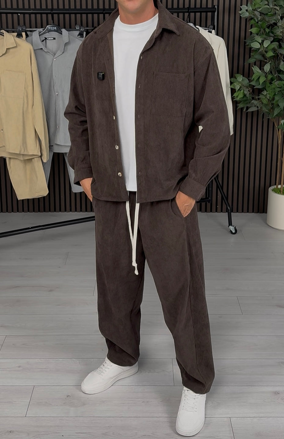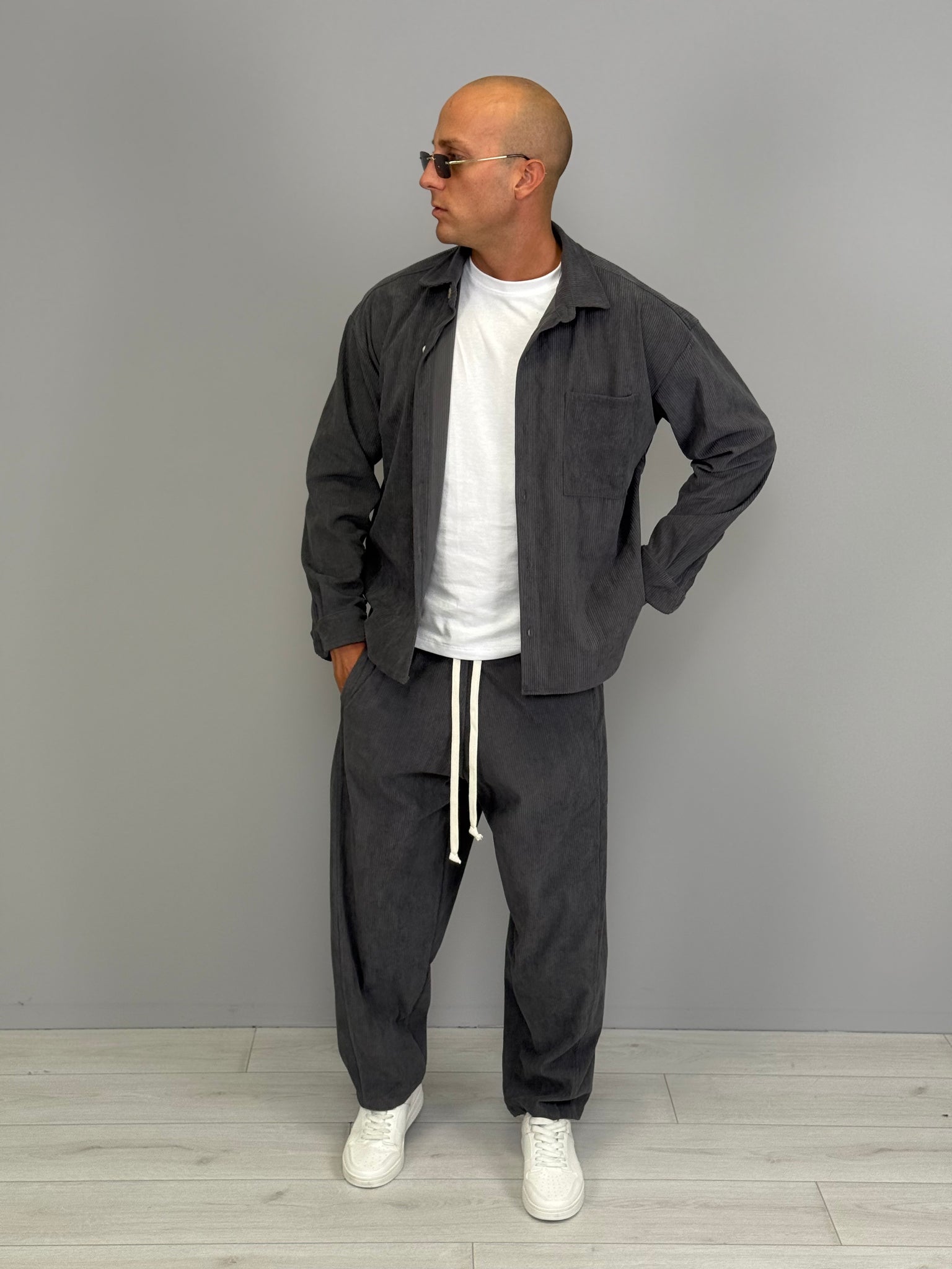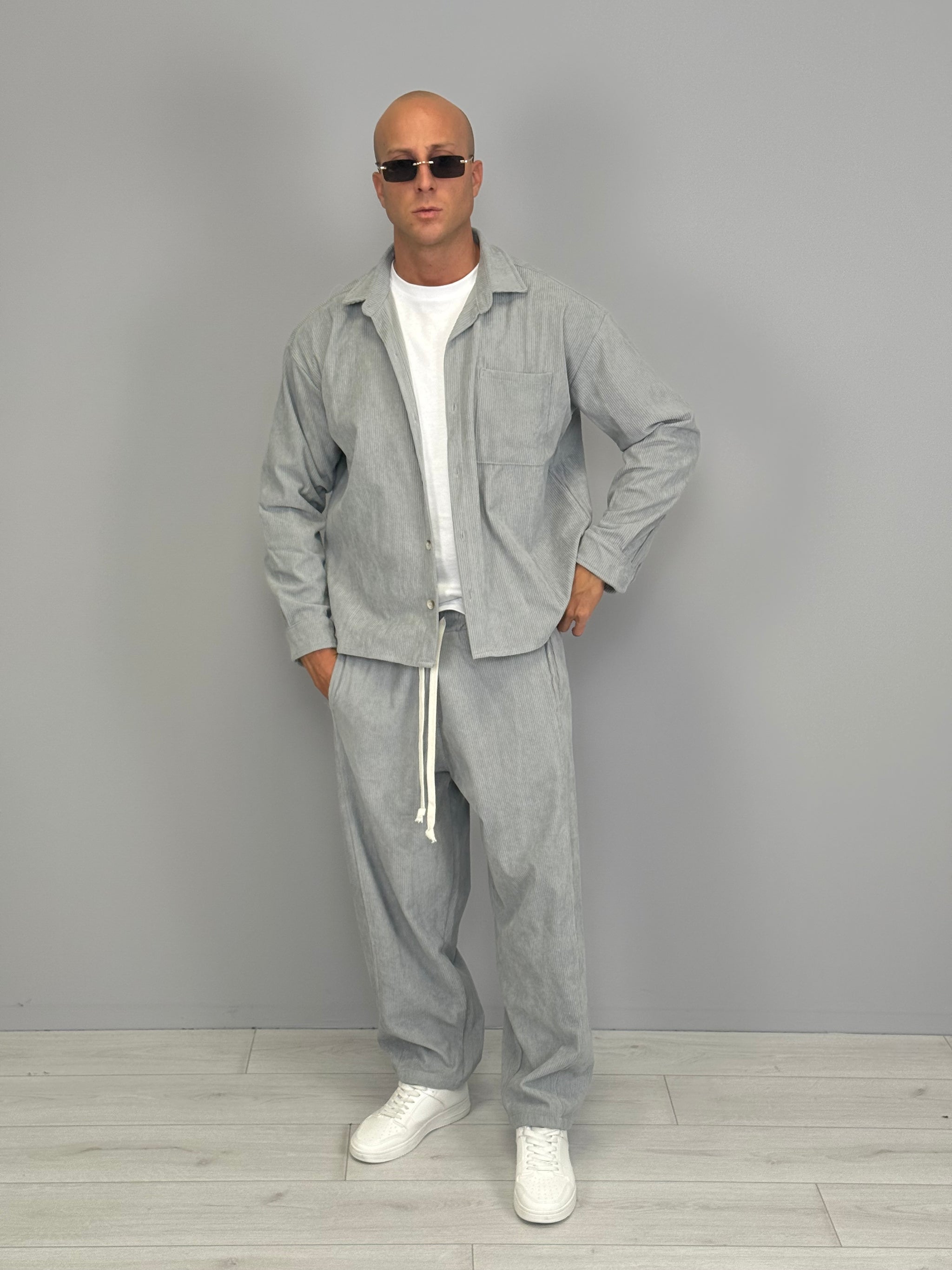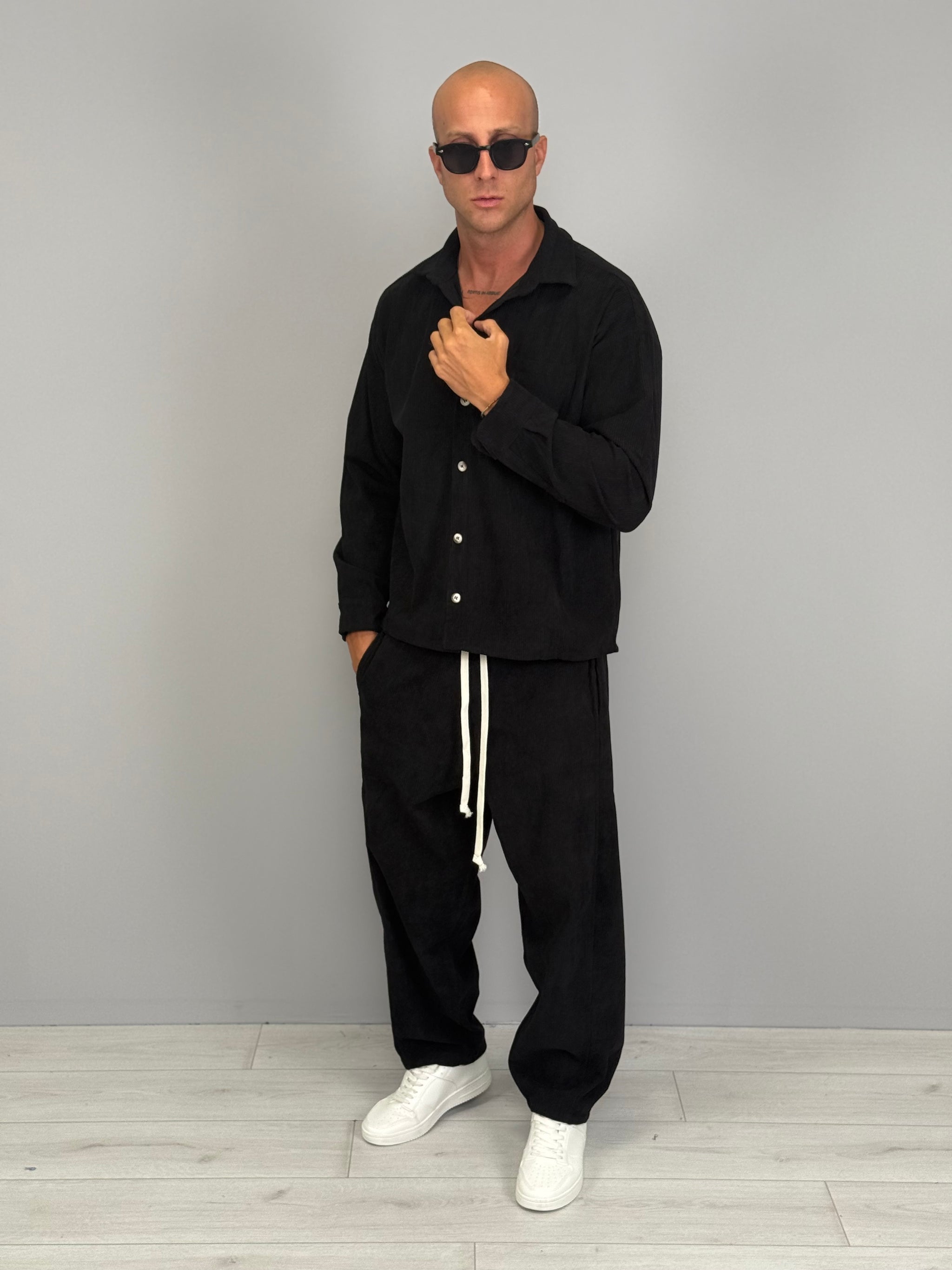 Composto da camicia overshirt e pantalone ampio con coulisse, questo completo offre una vestibilità regolare che valorizza la figura senza rinunciare alla libertà di movimento. Il tessuto in velluto a costine dona una texture elegante e un tocco sofisticato, mentre la chiusura frontale a bottoni e le tasche laterali ne accentuano la praticità.