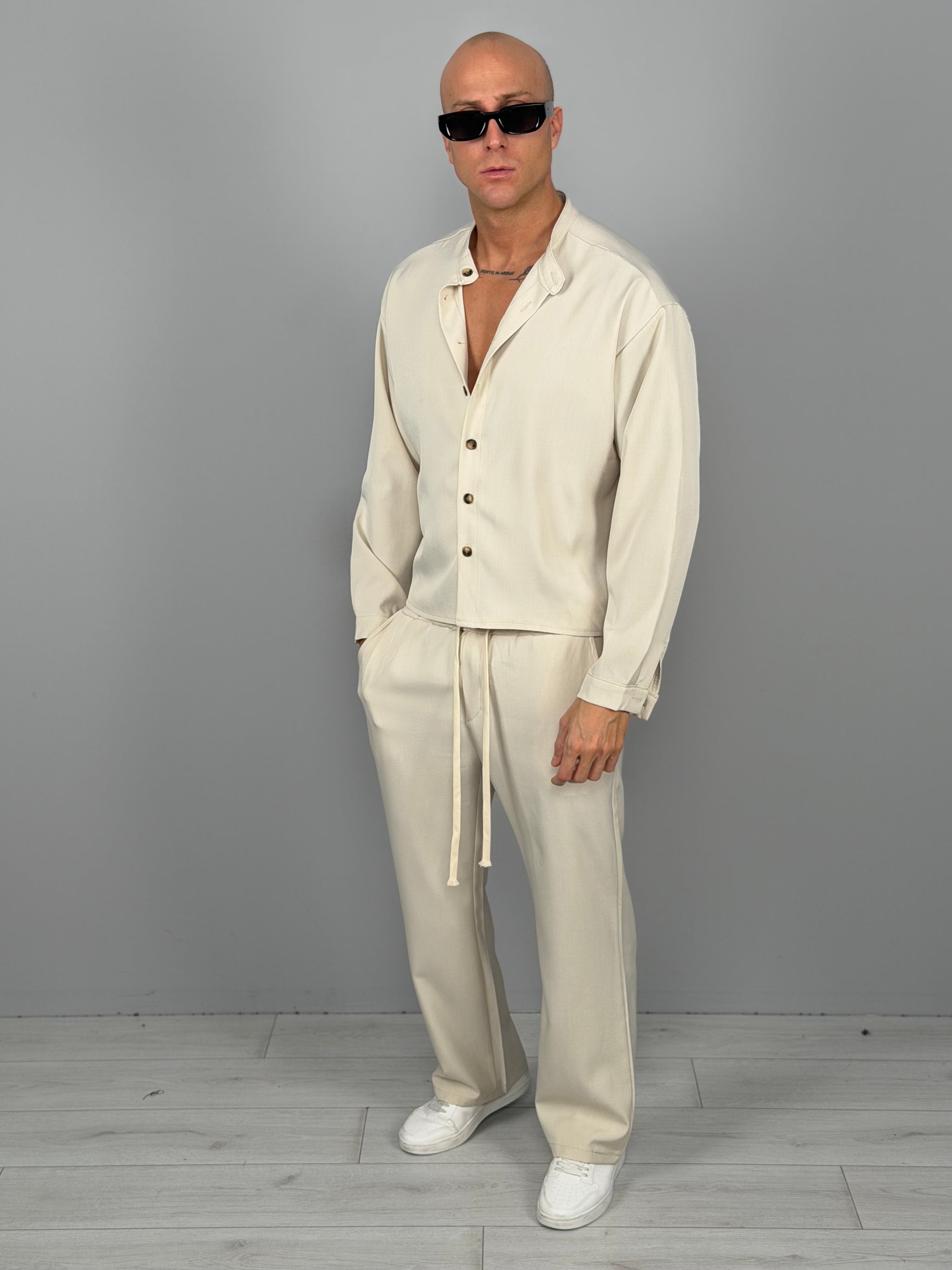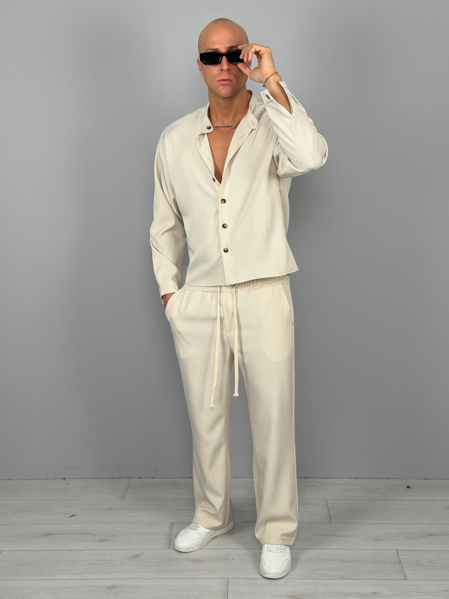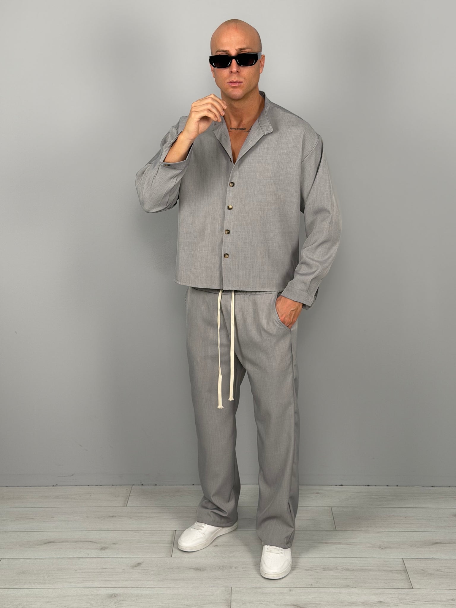 La camicia presenta un design minimal con abbottonatura frontale e collo morbido, dal taglio leggermente cropped per un look moderno. Il pantalone, con coulisse regolabile in vita, offre comfort e praticità mantenendo una silhouette fluida e raffinata.