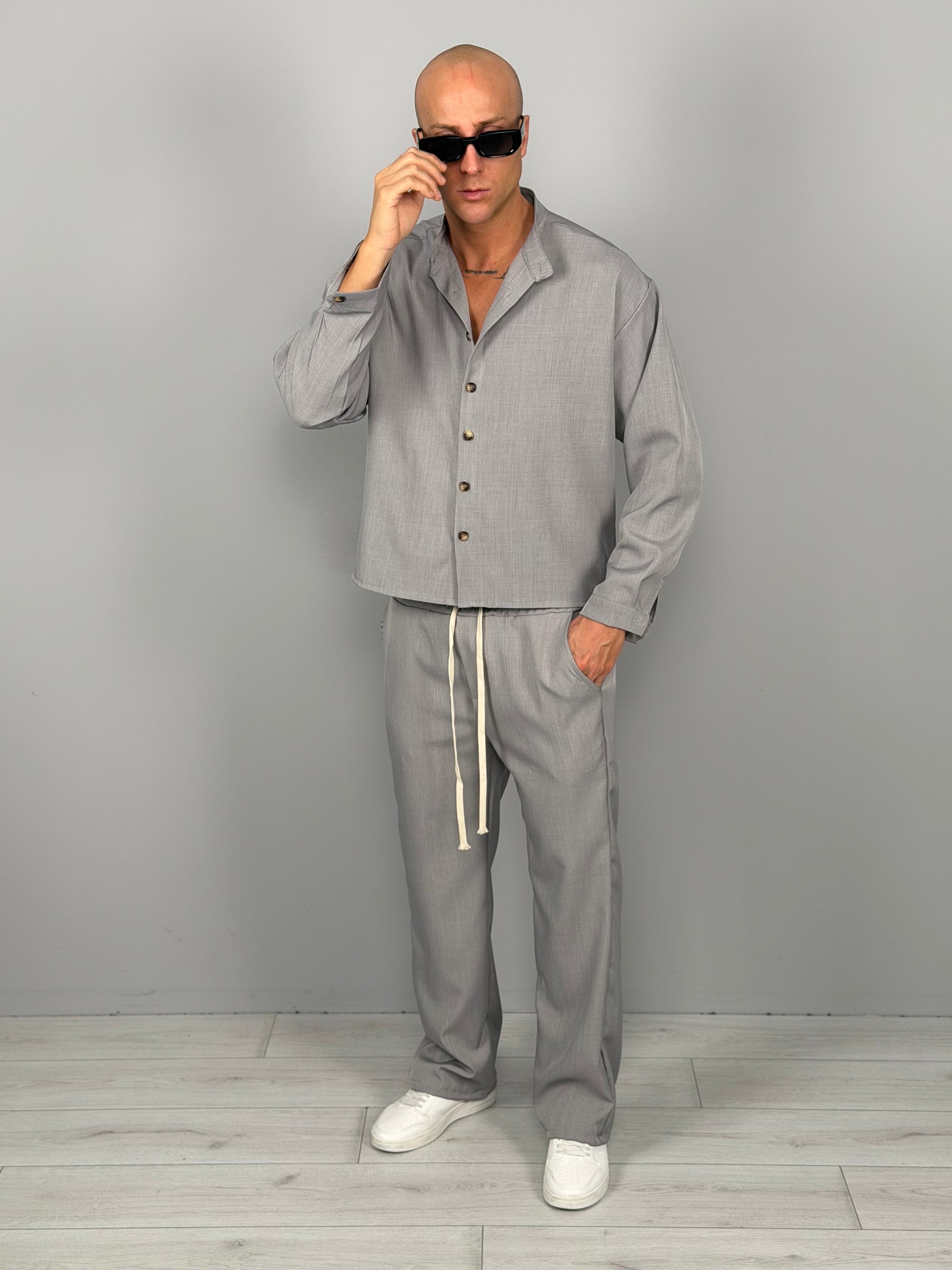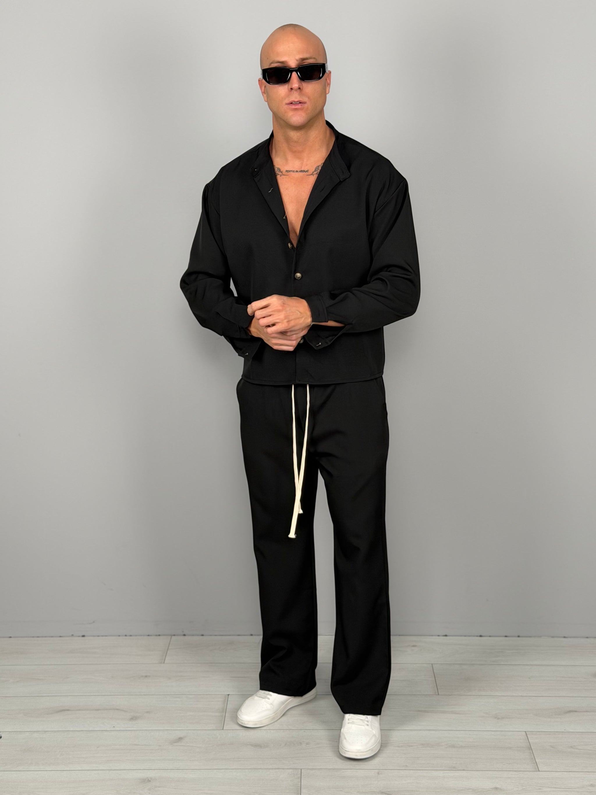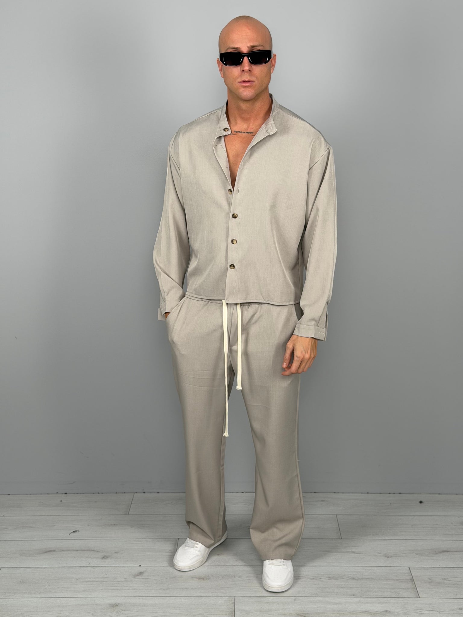 La camicia presenta un design minimal con abbottonatura frontale e collo morbido, dal taglio leggermente cropped per un look moderno. Il pantalone, con coulisse regolabile in vita, offre comfort e praticità mantenendo una silhouette fluida e raffinata.
