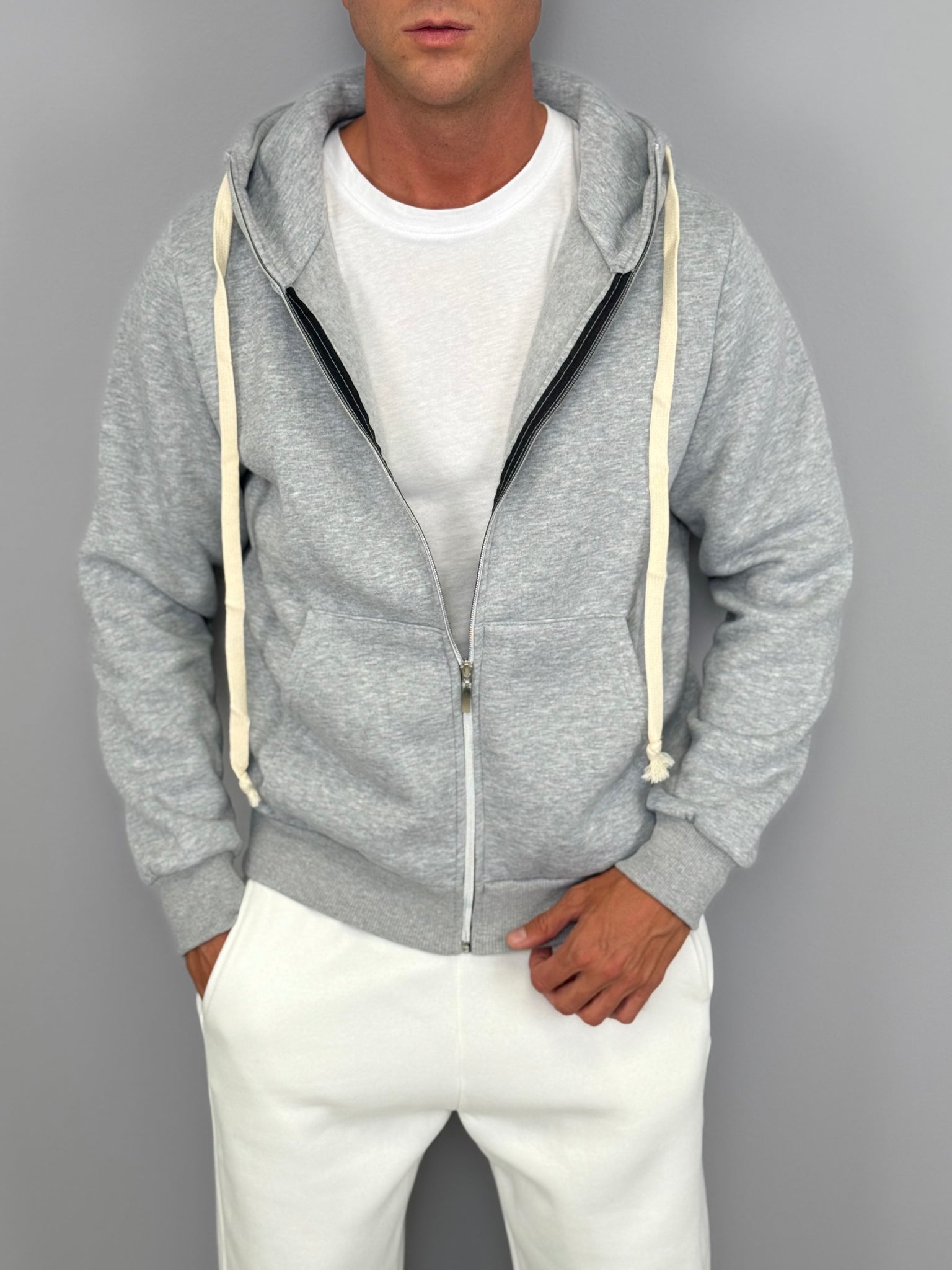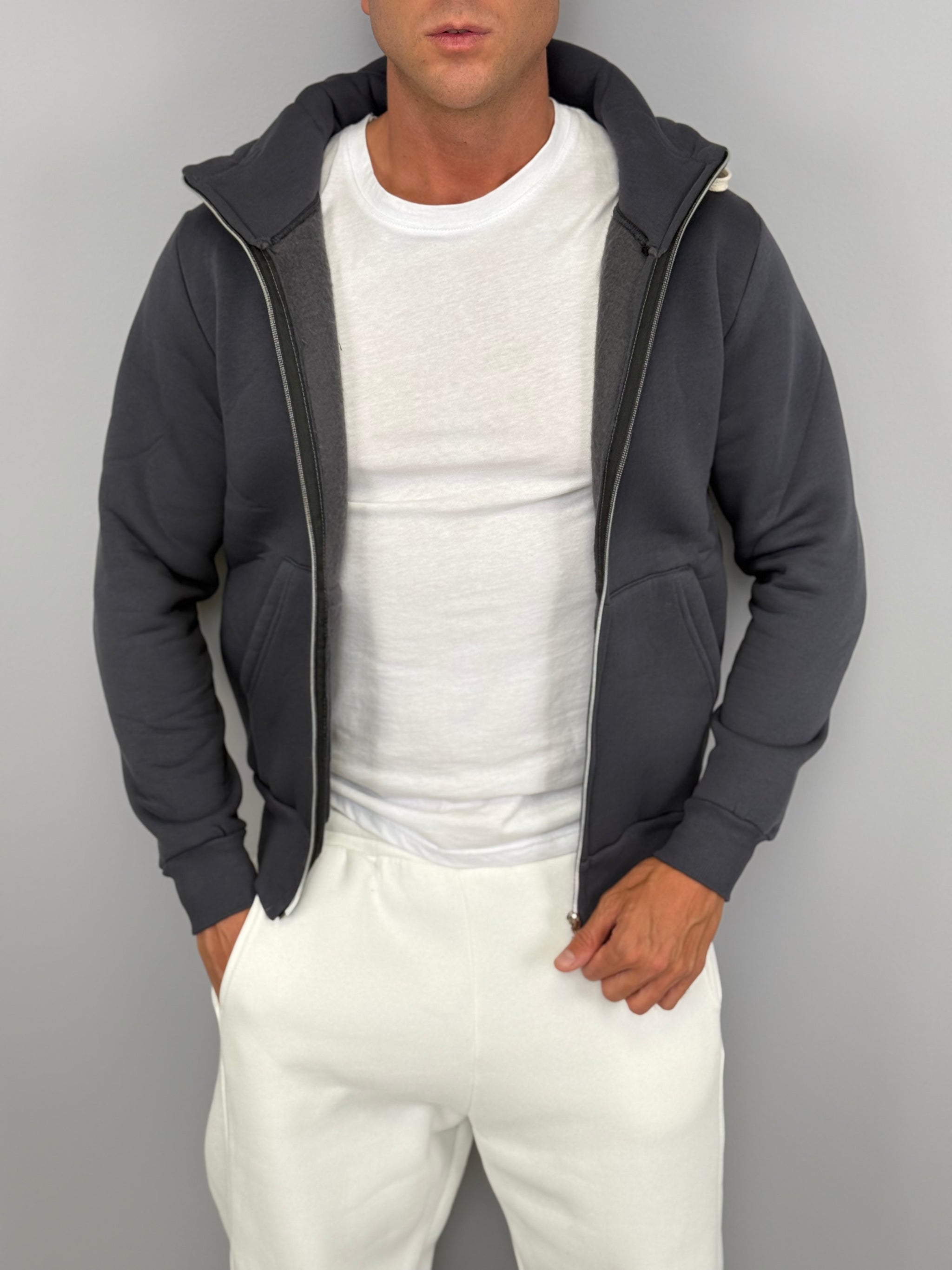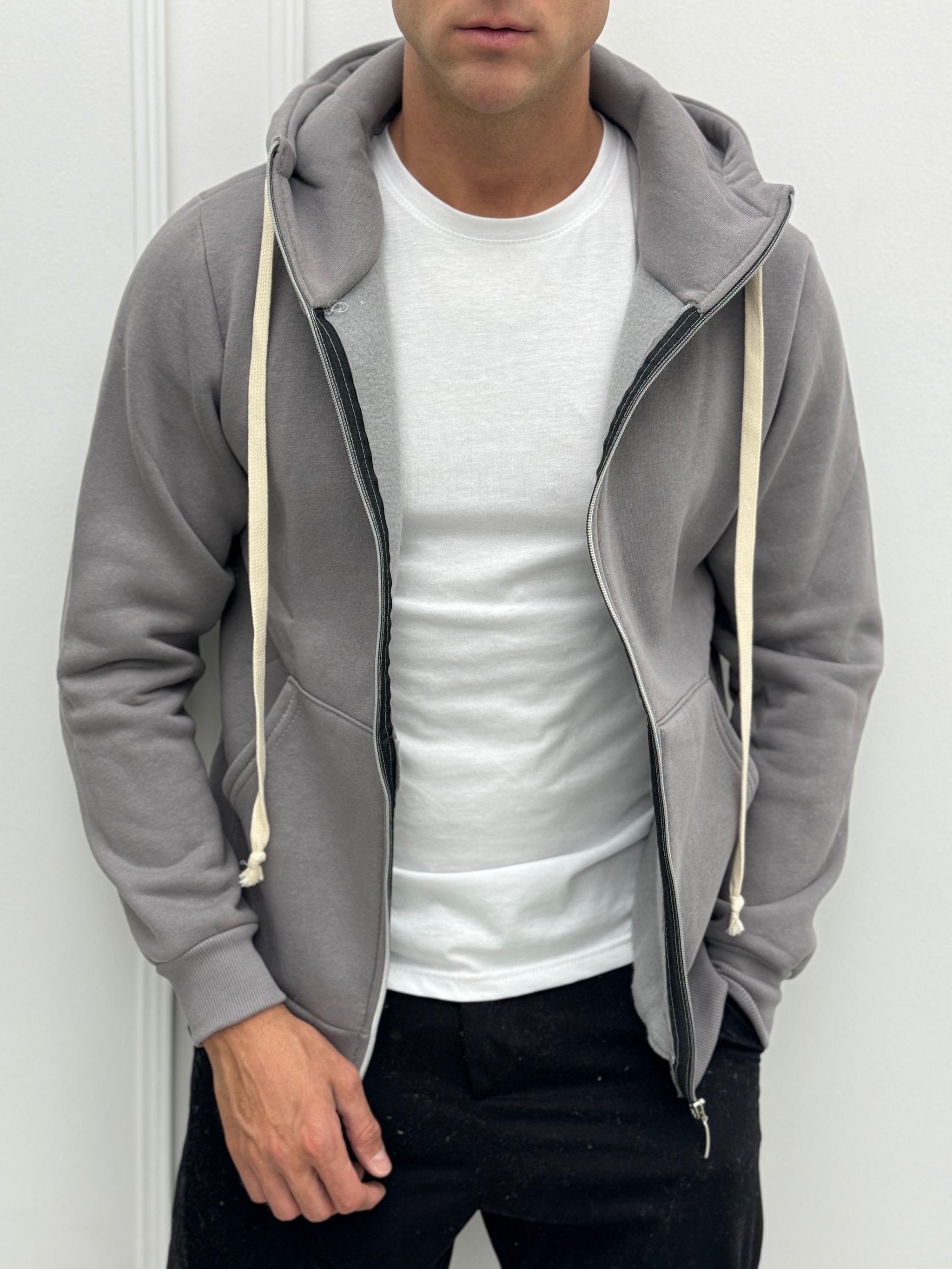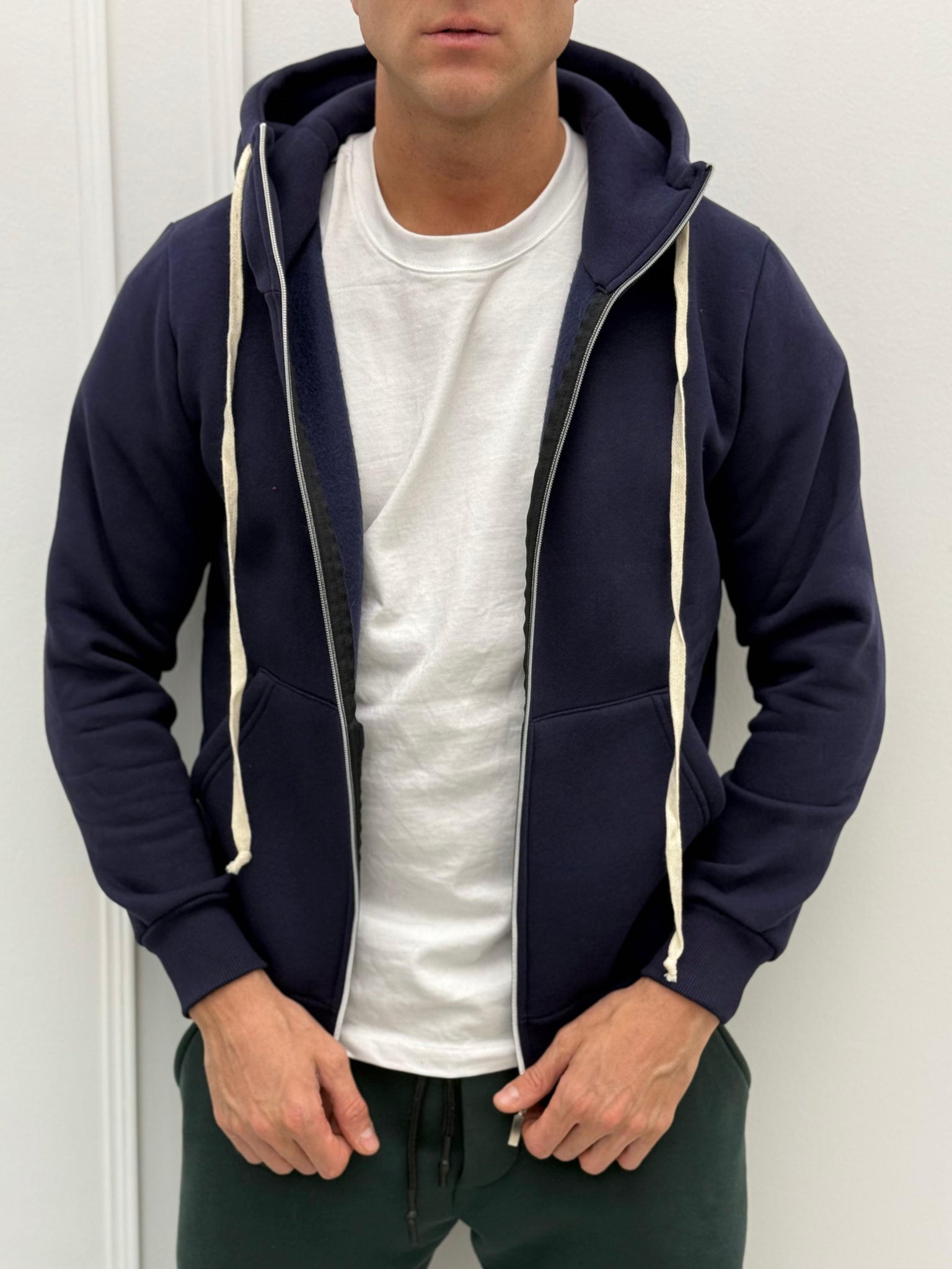 Il design è pulito e moderno: chiusura a zip frontale, cappuccio con coulisse a contrasto e tasche laterali per la massima praticità. I polsini e il fondo a costine assicurano una vestibilità regolare e confortevole, valorizzando la silhouette senza costrizioni.
