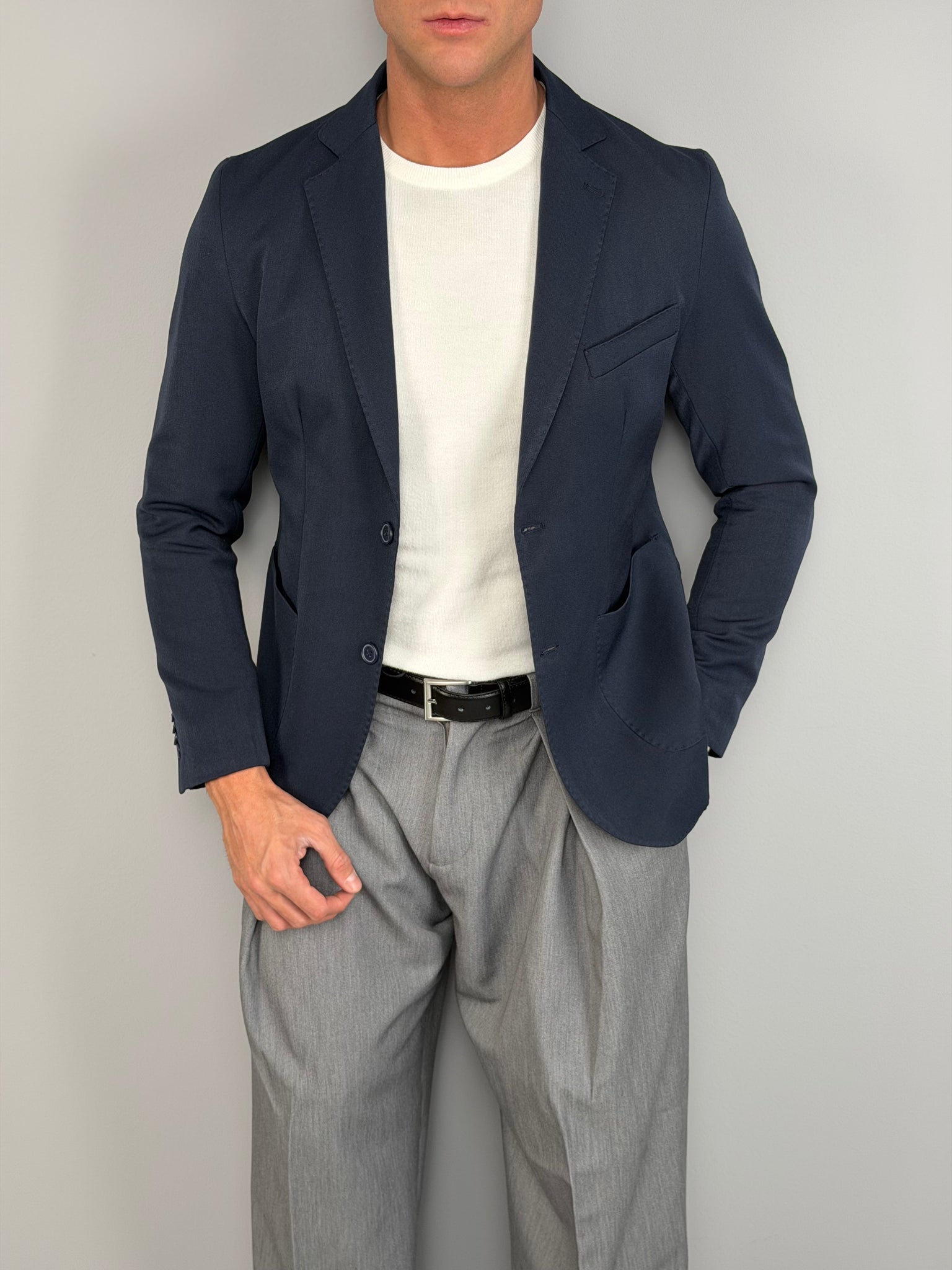 Il design monopetto con rever classico e chiusura a due bottoni conferisce un’allure raffinata e versatile, ideale sia per contesti formali che per outfit più moderni e smart-casual. Le tasche applicate e il taschino sul petto aggiungono un tocco sartoriale, mentre la linea pulita valorizza ogni abbinamento: dalla camicia con cravatta al semplice t-shirt per un look più rilassato ma curato.