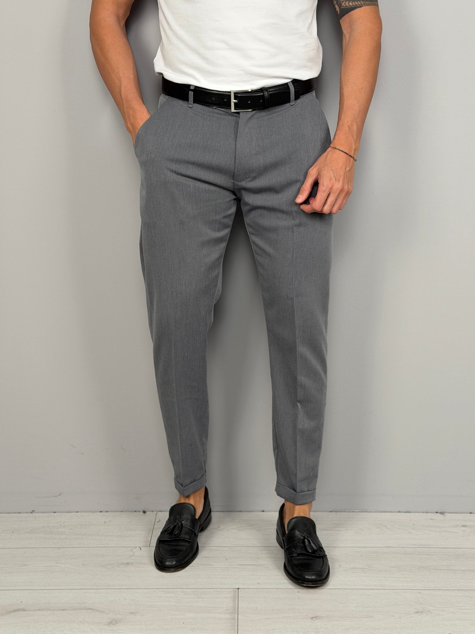 La vestibilità asciutta valorizza la silhouette, mentre il fondo capri con risvoltino dona un tocco moderno e raffinato, ideale da abbinare a mocassini o sneakers. Disponibile in diverse varianti colore, è un pantalone versatile da indossare sia nel tempo libero che in occasioni più eleganti.