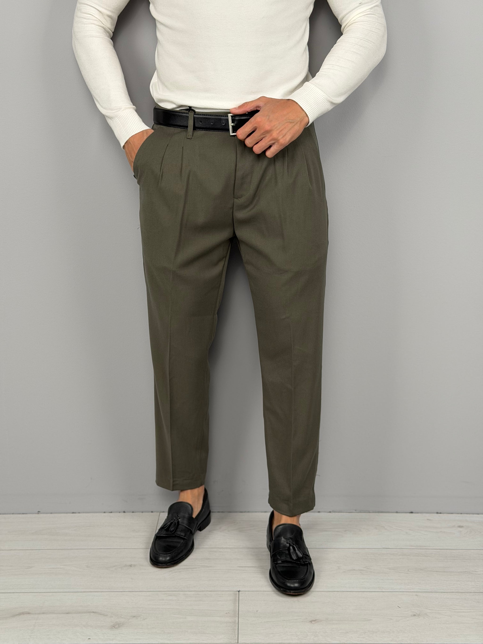 Dettagli: pinces frontali, chiusura con bottone e zip, tasche laterali, tasche posteriori a filetto