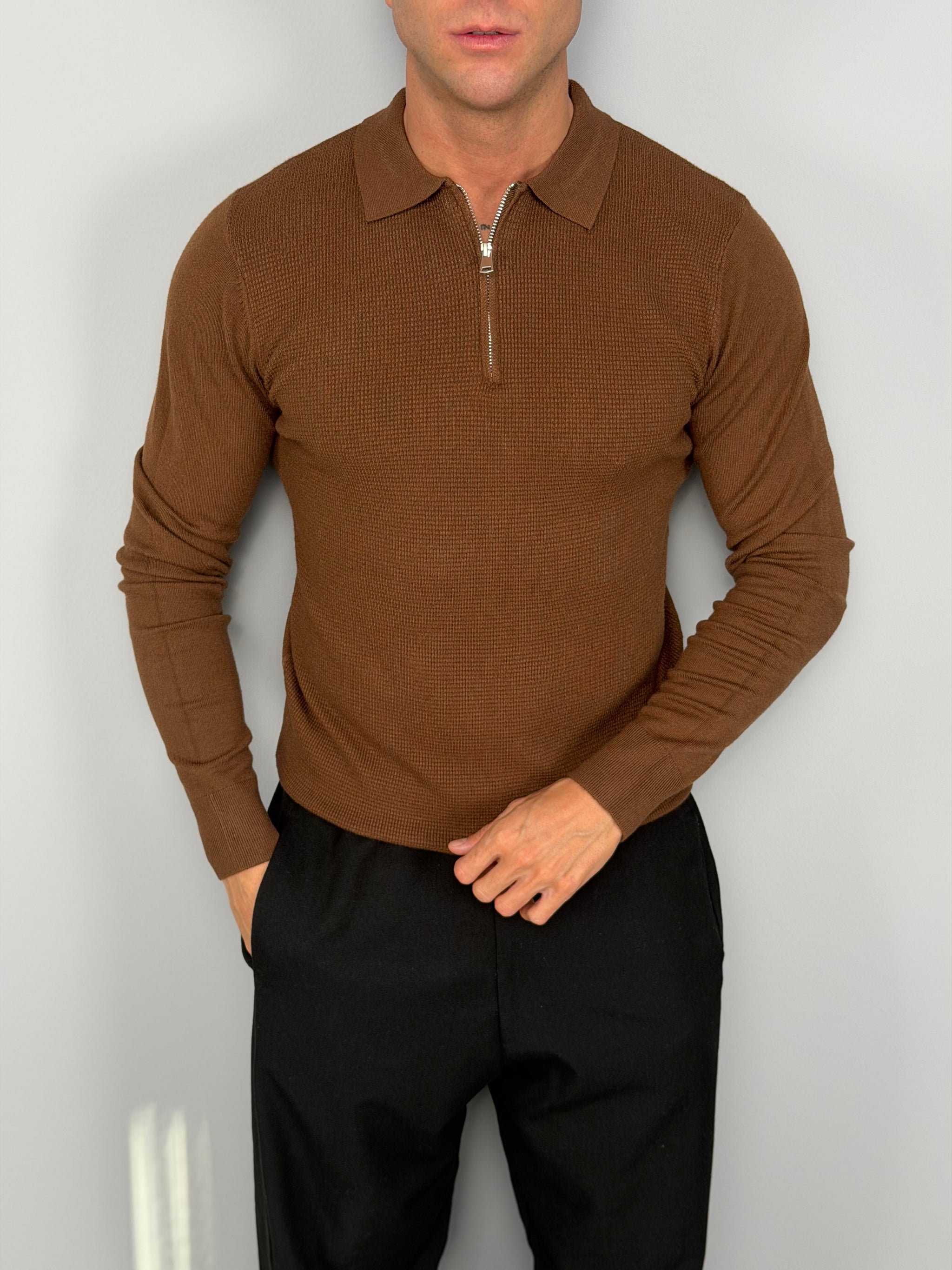 Il design è definito dal colletto classico e dalla mezza zip metallica, che aggiunge un tocco contemporaneo e permette di personalizzare l’apertura in base al look. La trama fine e compatta della maglina valorizza la silhouette e rende questo capo perfetto sia sotto una giacca che indossato da solo.
