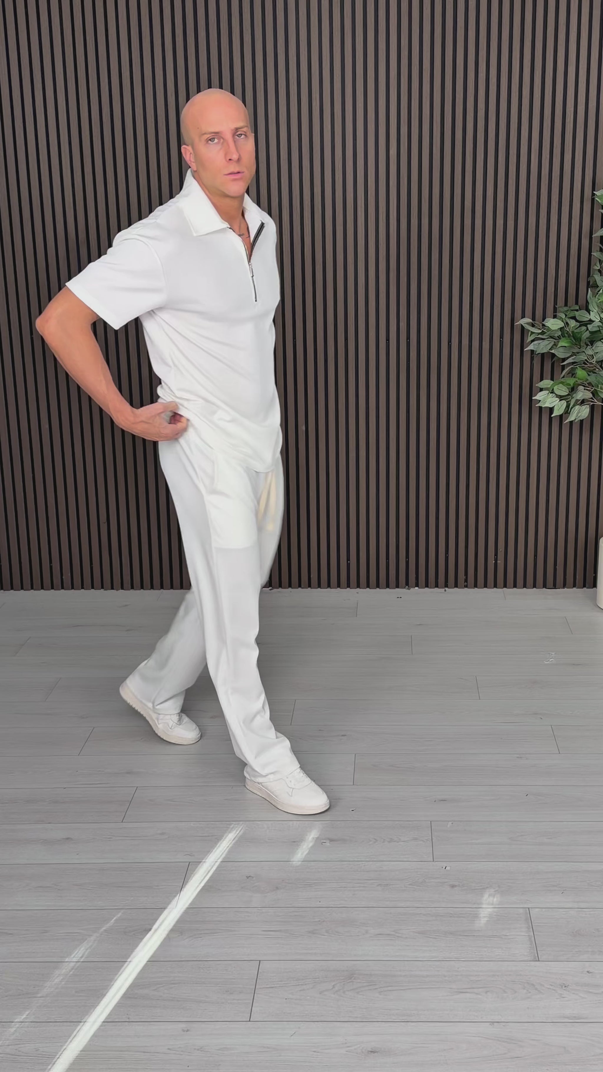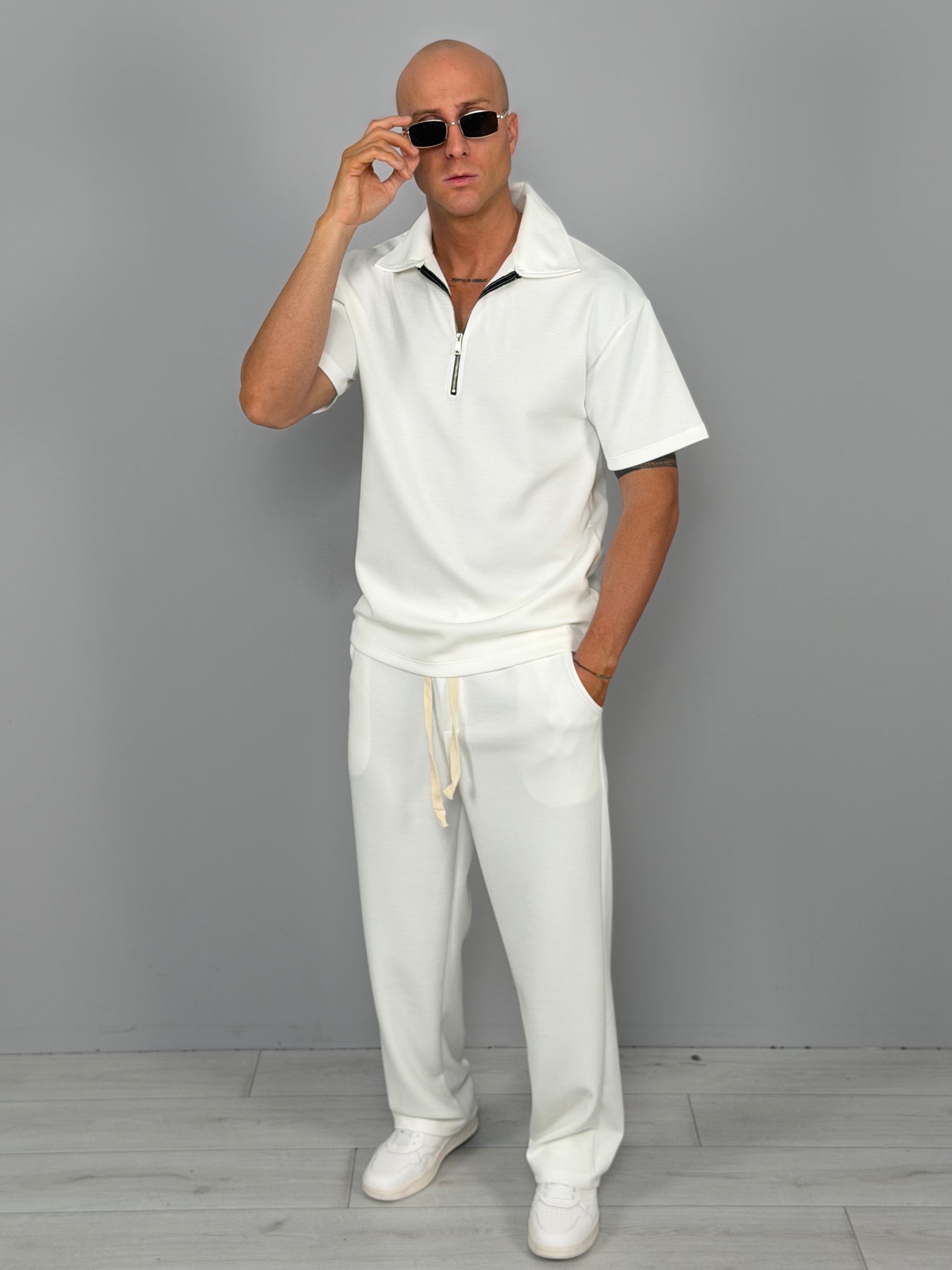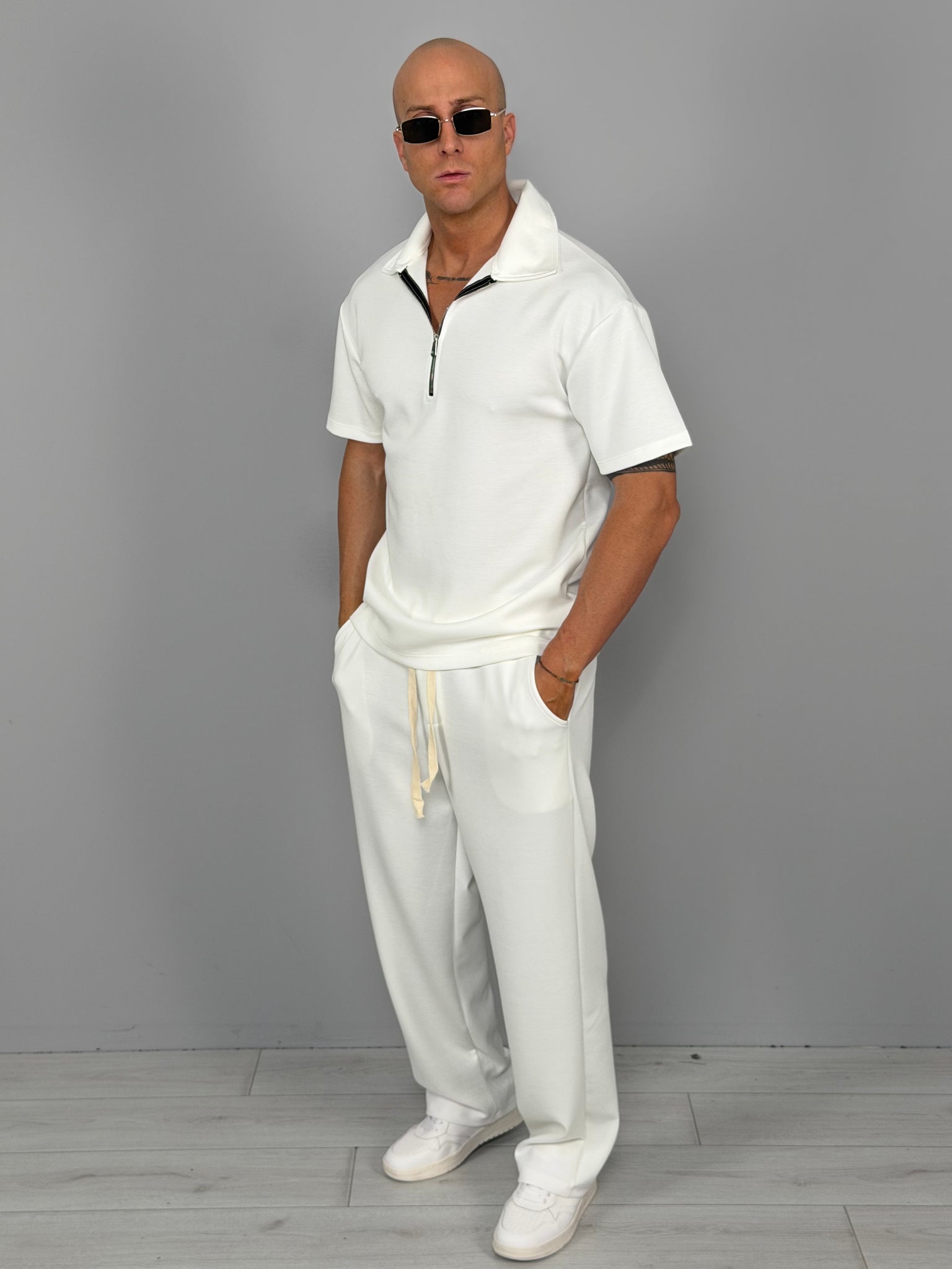 Realizzato in 60% poliestere, 35% viscosa e 5% elastico, il tessuto è morbido, fluido ed elasticizzato: garantisce comfort, struttura e libertà di movimento per tutta la giornata. La polo con zip frontale e colletto strutturato aggiunge un tocco sport-chic, mentre il pantalone con elastico in vita e laccio regolabile assicura praticità e vestibilità rilassata ma curata.